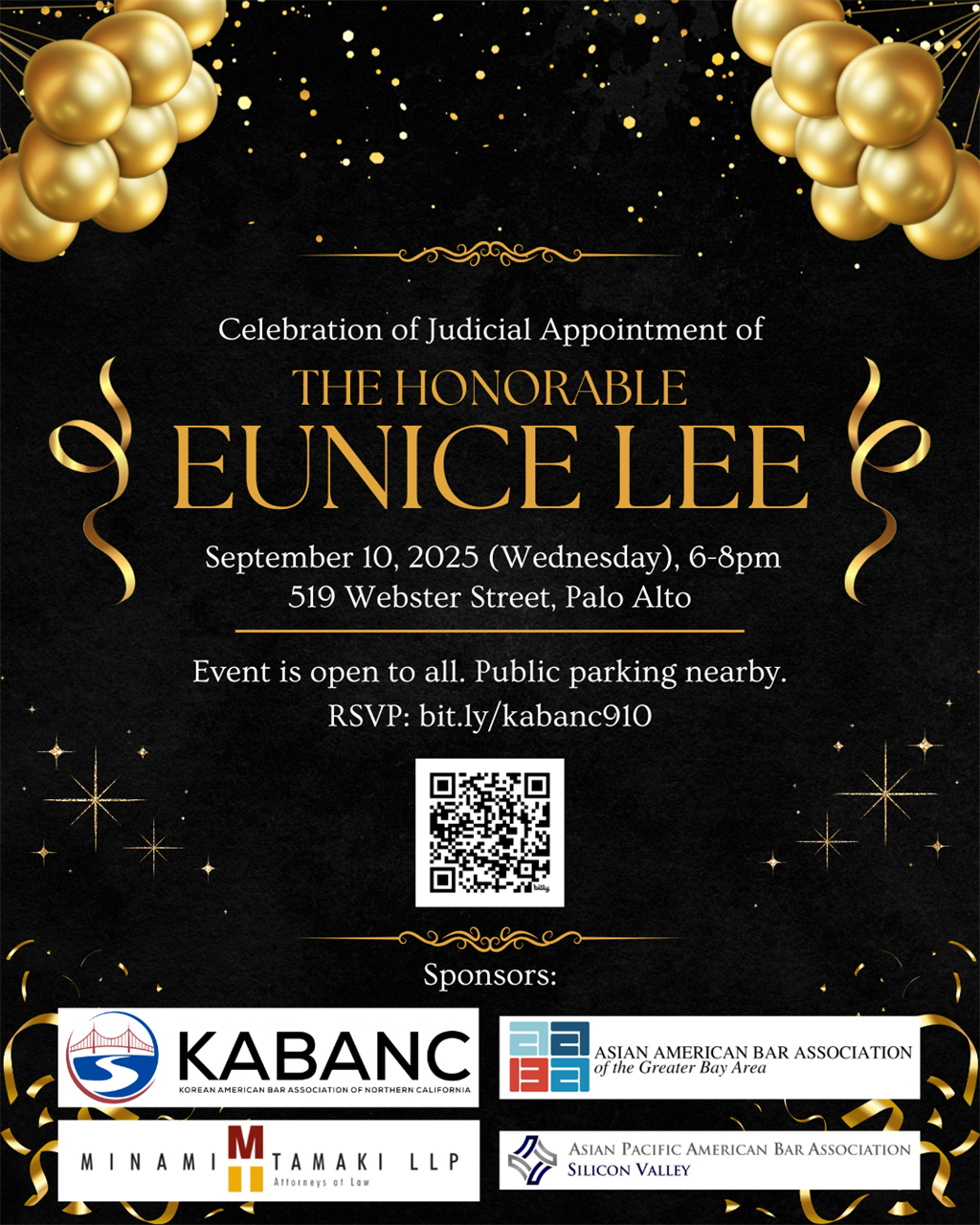 Back to All Events Celebration of Judicial Appointment of the Honorable Eunice Lee Wednesday, September 10, 2025 6:00 PM 8:00 PM 519 Webster Street, Palo Alto, CA United States (map) Google Calendar ICS