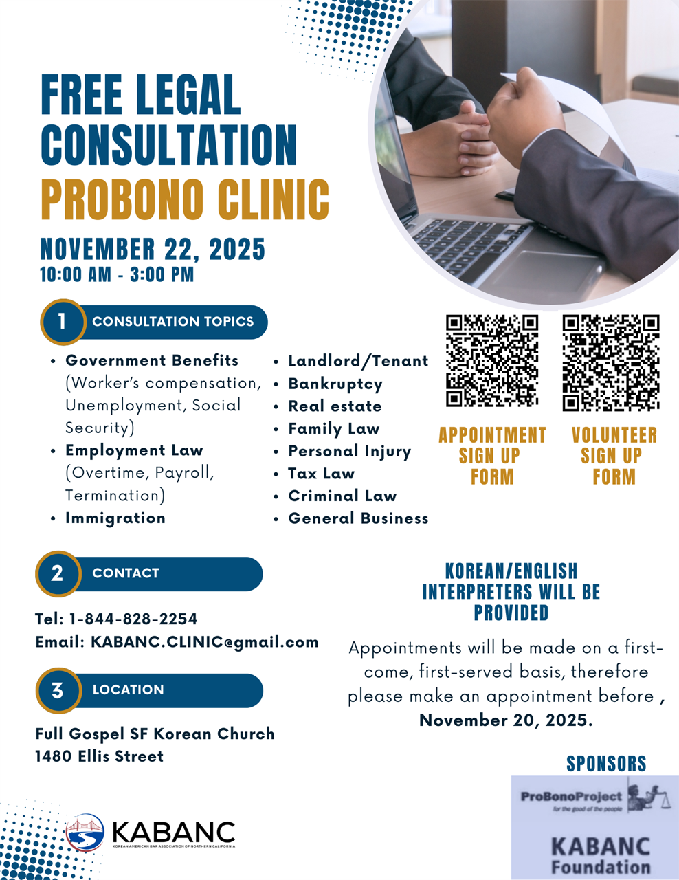 Back to All Events Pro Bono Clinic Saturday, November 22, 2025 10:00 AM 3:00 PM Full Gospel SF Korean Church 1480 Ellis Street San Francisco, CA, 94115 United States (map) Google Calendar ICS